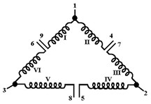 En la ilustración anterior, las bobinas se identifican con números romanos y los cables con números regulares. Tenga en cuenta que algunas bobinas están conectadas permanentemente (I a II, II a IV y V a VI) y no se pueden separar. Esto evita probar la resistencia de aislamiento de bobina a bobina para las seis bobinas y sus combinaciones.